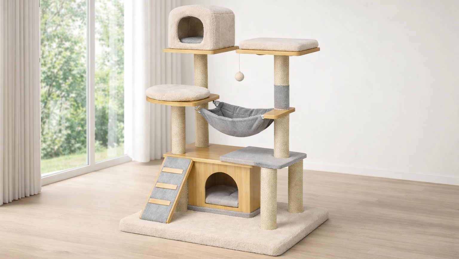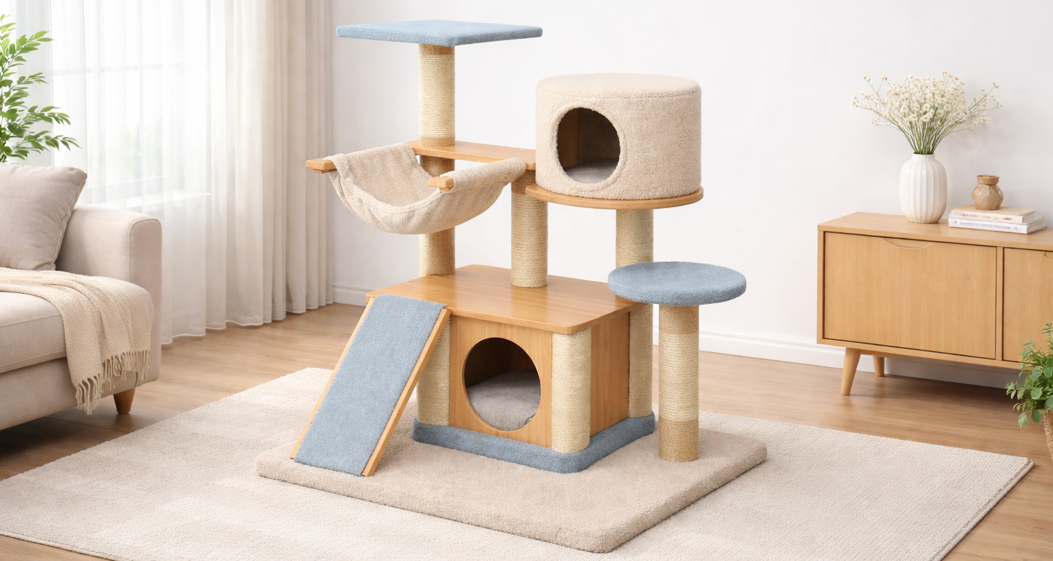 Kratzbaum holz und sisal beige blau